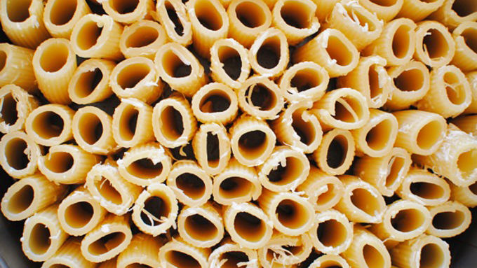 Στο μεταξύ βράζετε τα rigatoni σε μπόλικο αλατισμένο νερό ένα λεπτό λιγότερο από όσο αναγράφεται στην συσκευασία. Έτσι, μετά το ψήσιμο θα γίνουν al dente και κατά το στήσιμο θα στέκονται ευκολότερα όρθια. Σουρώνετε και ρίχνετε αμέσως 1 κουταλιά της σούπας ελαιόλαδο ώστε να μην κολλήσουν μεταξύ τους. Ανακατεύετε καλά προσέχοντας να μην σπάσουν.
