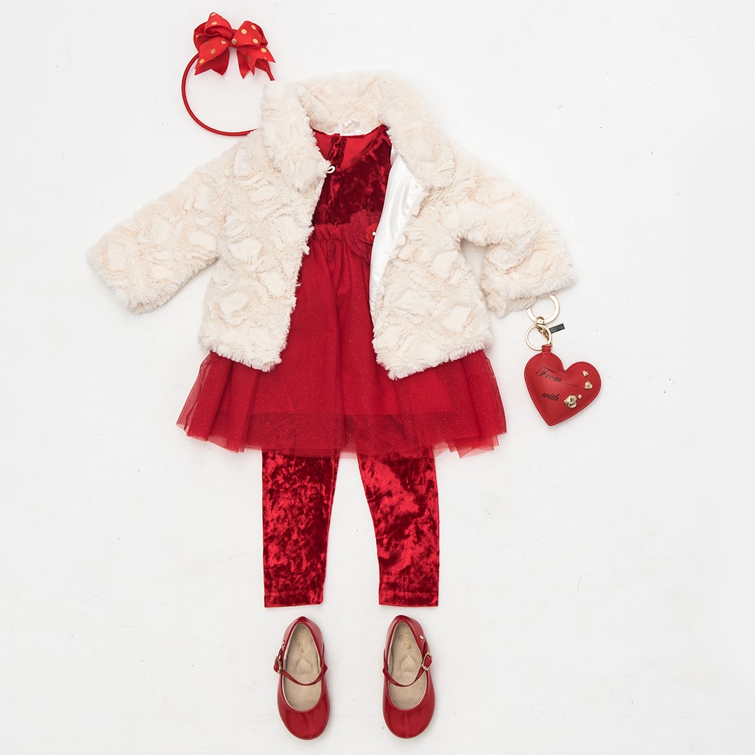 Οι κόκκινες και λευκές αποχρώσεις, σε γούνινες και βελούδινες υφές θα αναδείξουν το στυλ κάθε μικρής fashionista. Από το εορταστικό σύνολο δε μπορούν να λείπουν οι κόκκινες μπαλαρίνες.