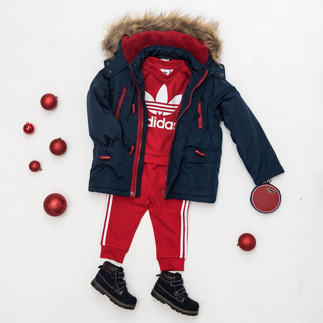 Κρατήστε τον μικρό σας ζεστό και άνετο με ένα αθλητικό σύνολο σε κόκκινο χρώμα. Δώστε του ένα cool vibe επιλέγοντας ένα oversized μπουφάν με γούνα στην κουκούλα.
