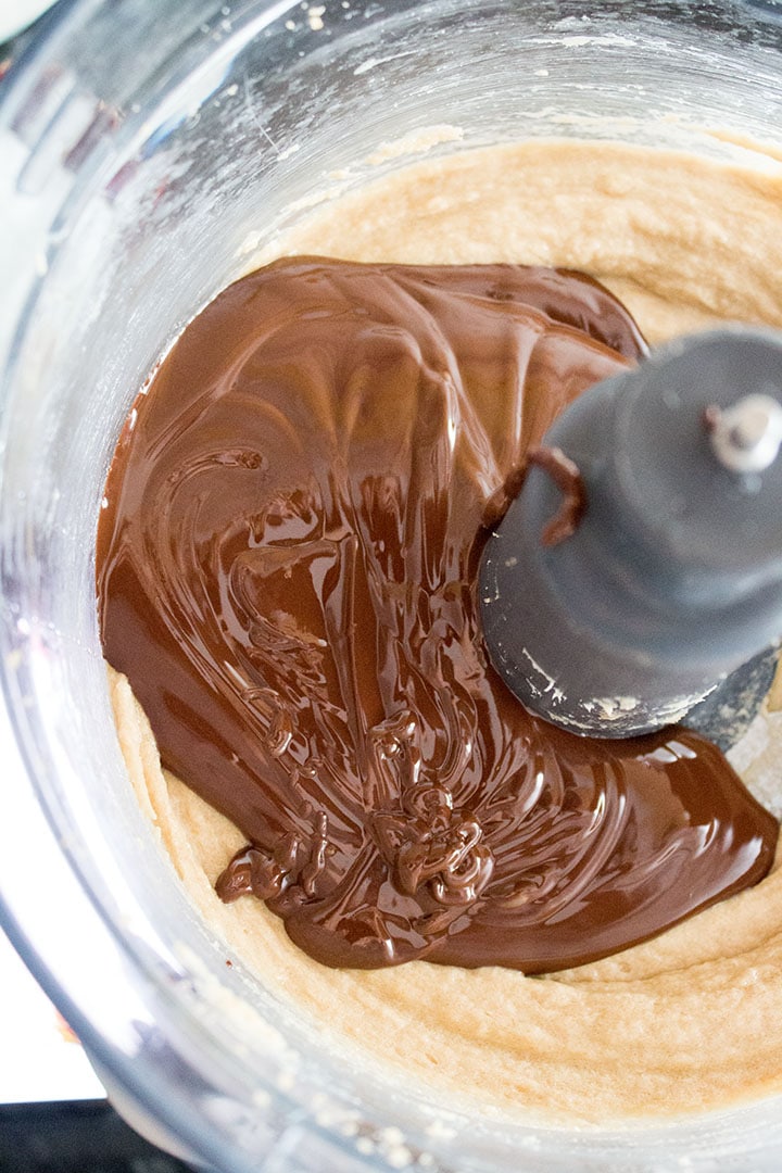 Προσθέτετε στο παραπάνω μείγμα τη λιωμένη σοκολάτα και ανακατεύετε με το μίξερ χειρός μέχρι να ομογενοποιηθούν τα υλικά μεταξύ τους.