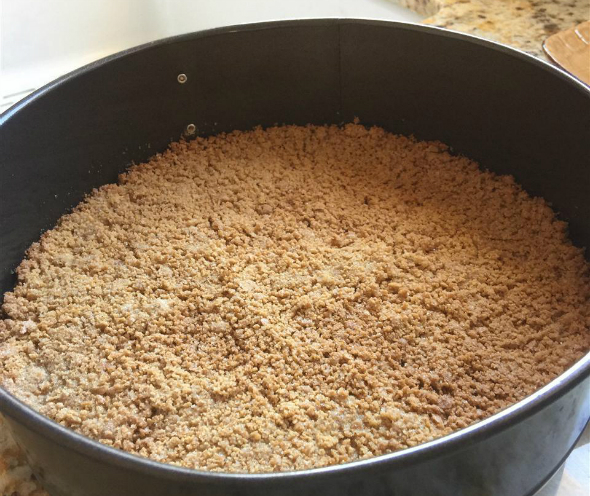 Σπάτε τα μπισκότα, ρίχνετε τα κομματάκια στο multi μαζί με το βούτυρο και μια κουταλιά της σούπας πραλίνα και χτυπάτε το μίγμα μέχρι να σβολιάσει.
