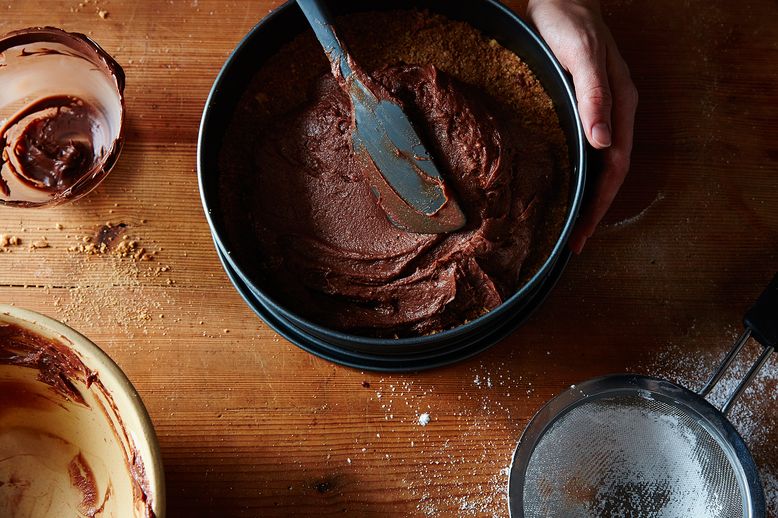 Στη συνέχεια, βγάζετε το ταψάκι απ’ το ψυγείο, απλώνετε το μίγμα ομοιόμορφα επάνω στη βάση σας και πασπαλίζετε με τα υπόλοιπα φουντούκια.