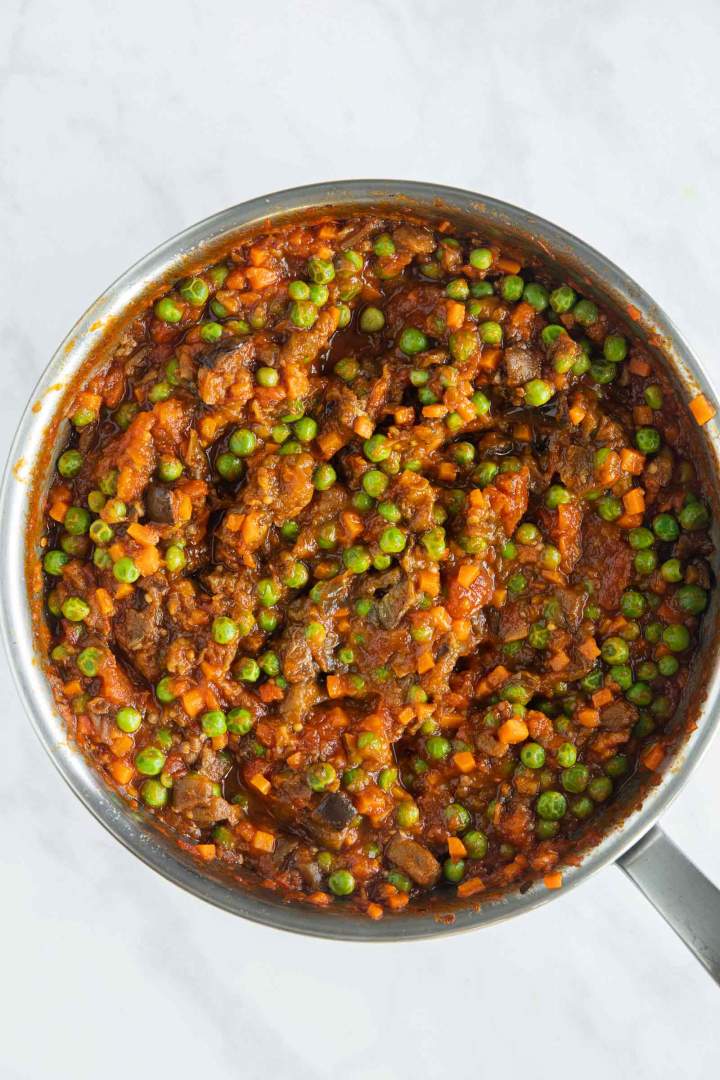 Ρίχνετε μέσα τα λαχανικά (καρότα, αρακά, σέλερι) και τα αρωματικά (θυμάρι, δεντρολίβανο, δάφνη) και σωτάρετε ώσπου να μαλακώσουν τα καρότα.