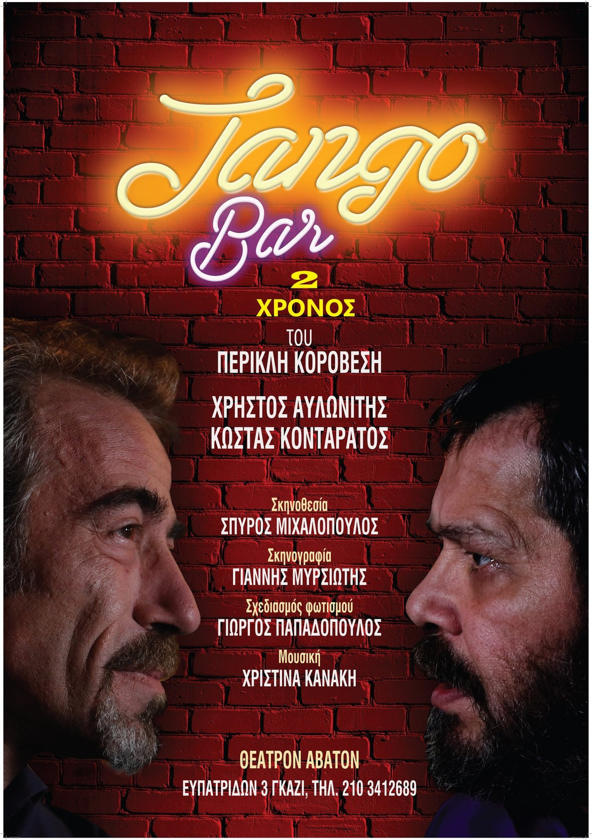 Μετά τον περσινό, πρώτο κι επιτυχημένο κύκλο παραστάσεων, ο Σπύρος Μιχαλόπουλος και ένα ντουέτο αξιόλογων ηθοποιών (Χρήστος Αυλωνίτης, Κώστας Κονταράτος) μεταφέρουν ξανά στη σκηνή του θεάτρου Άβατον τη μαύρη κωμωδία του Περικλή Κοροβέση “Tango Bar”.