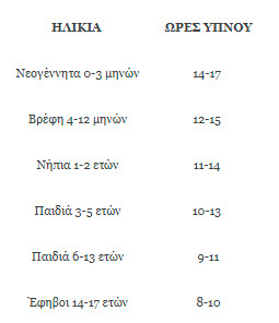 Οι ώρες που πρέπει να κοιμάται ένα παιδί ανάλογα με την ηλικία του για να είναι υγιές φαίνονται στον παρακάτω πίνακα: