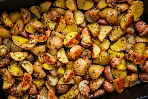 Βγάζετε απ’ το φούρνο, ανακατεύετε τις πατάτες να πάει η σάλτσα παντού, σερβίρετε και απολαμβάνετε!