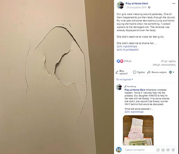 Η 9χρονη κόρη μου που ήταν υπεύθυνη για το περιστατικό, ήρθε στην κουζίνα και μου είπε κλαίγοντας ότι είχε κάτι να μου δείξει. Πήγα στο δωμάτιό τους και είδα την τρύπα στον τοίχο και τις τύψεις ζωγραφισμένες στο πρόσωπό της.
