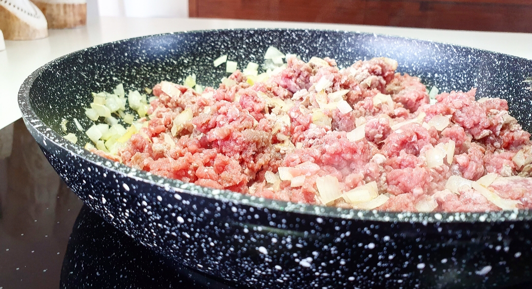 Αρχικά, τσιγαρίζετε το κρεμμύδι, το σκόρδο και τον κιμά σε μια κατσαρόλα ή σ’ ένα βαθύ και μεγάλο τηγάνι.