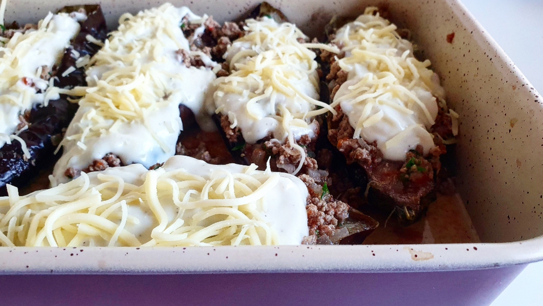 Όταν ψηθούν οι μελιτζάνες, τις ανοίγετε στην μέση κάθετα και τις αλατίζετε. Προσθέτετε στο άνοιγμα τον κιμά, την μπεσαμέλ και την τριμμένη κεφαλογραβιέρα.Ψήνετε για 20 λεπτά στους 180 βαθμούς στον αέρα.