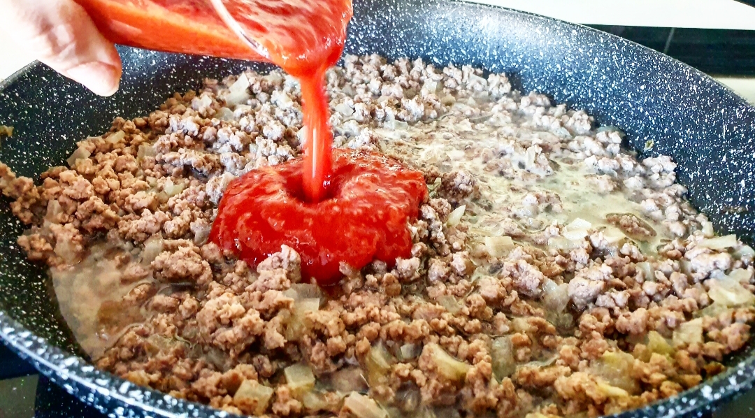 Μόλις τσιγαριστεί ο κιμάς, προσθέτετε το νερό και το αφήνετε να μαγειρευτεί για μισή ώρα. Στη συνέχεια, προσθέτετε την σάλτσα ντομάτας, τα μπαχαρικά και το αλατοπίπερο.