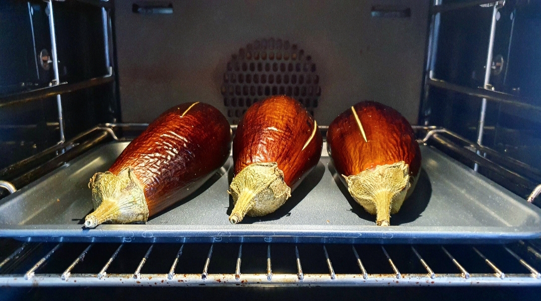 Αφού πλύνετε τις μελιτζάνες, τις χαράζετε και τις βάζετε πάνω σ’ ένα λαδωμένο ταψί και τις ψήνετε στους 200 βαθμούς στον αέρα για 50 λεπτά.