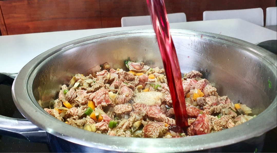 Τσιγαρίστε σε ελαιόλαδο το κρεμμύδι, τα καρότα, σκόρδο, το σέλινο και τα μανιτάρια. Ξεπλύνετε καλά το κρέας και προσθέστε το. Μόλις πάρει χρώμα, σβήστε το με κρασί.