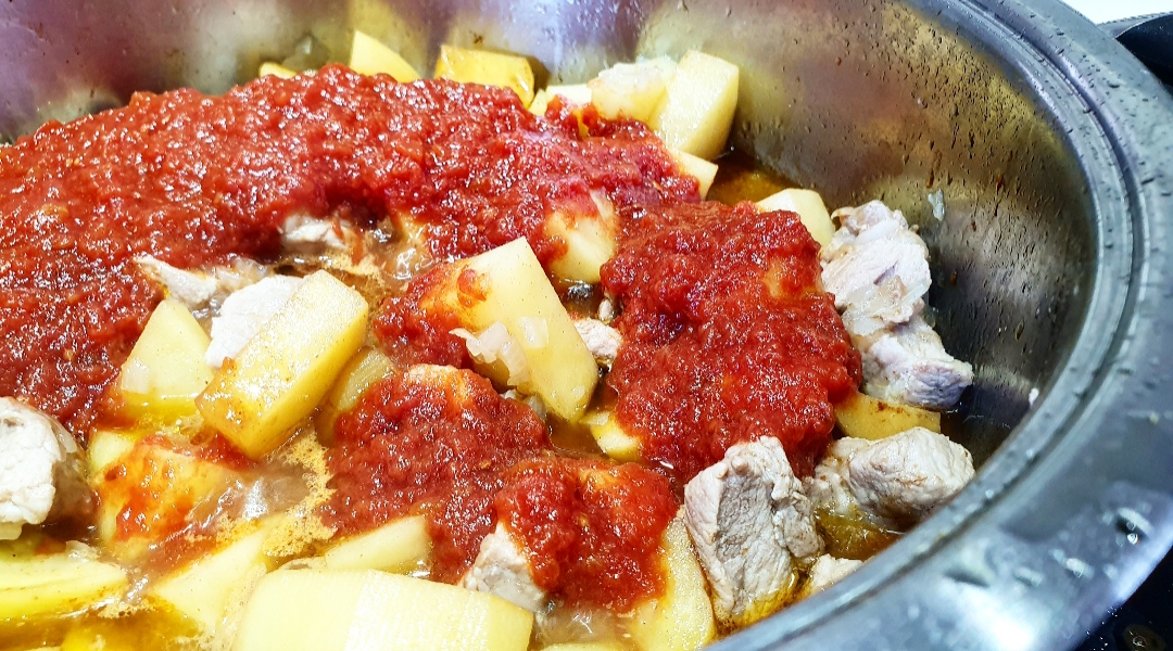 Προσθέτετε τις πατάτες και την σάλτσα ντομάτας στην κατσαρόλα με το κρέας, ανακατεύετε καλά και μαγειρεύετε ώσπου οι πατάτες να μαλακώσουν.