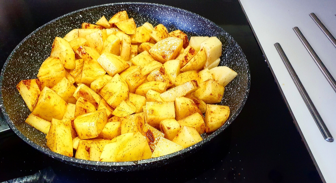 Στο μεταξύ, πλένετε, καθαρίζετε και κόβετε τις πατάτες σε μικρά κομμάτια. Τηγανίζετε ελάχιστα, μαζί με την πάπρικα, ίσα ίσα να πάρουν λίγο χρώμα.