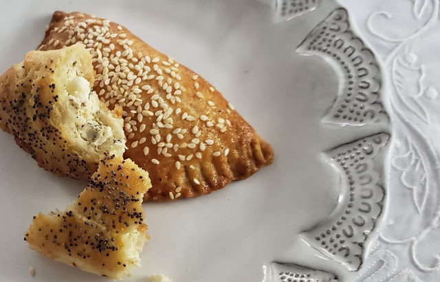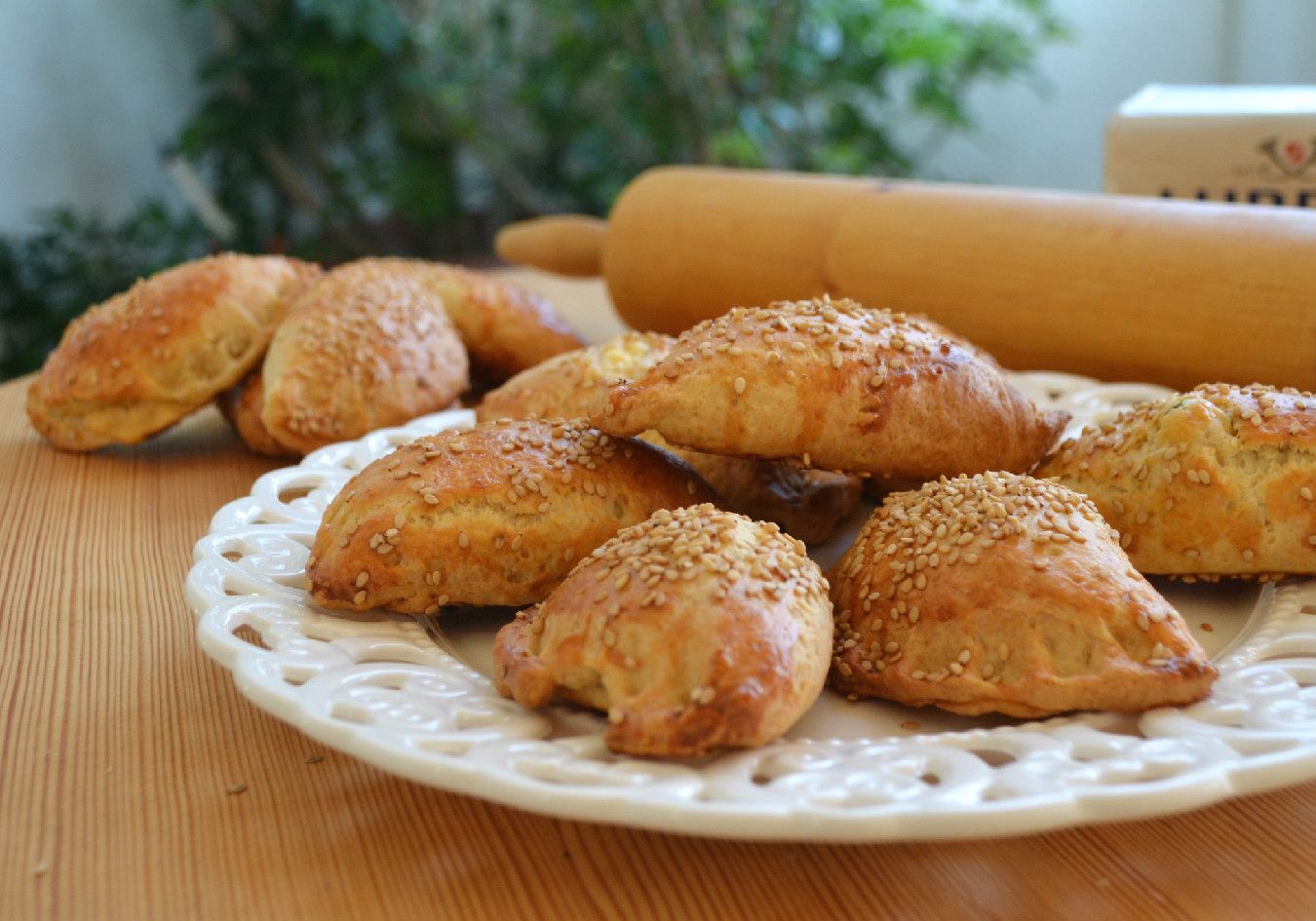 Μ’ ένα πινέλο, αλείφετε τα τυροπιτάκια σας με τον κρόκο του αυγού κι ύστερα πασπαλίζετε με σουσάμι.