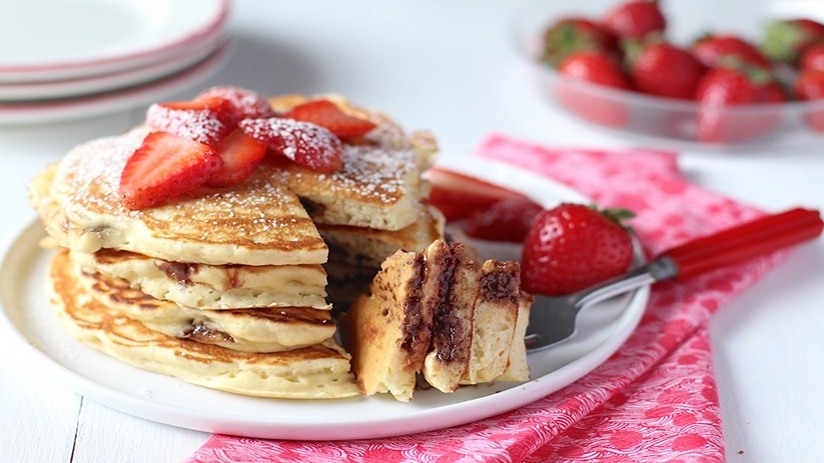 Σερβίρουμε τις γλυκές τηγανίτες με κομμάτια από ένα φρούτο της αρεσκείας μας (μπανάνα, φράουλες, μήλο ή βατόμουρο)
