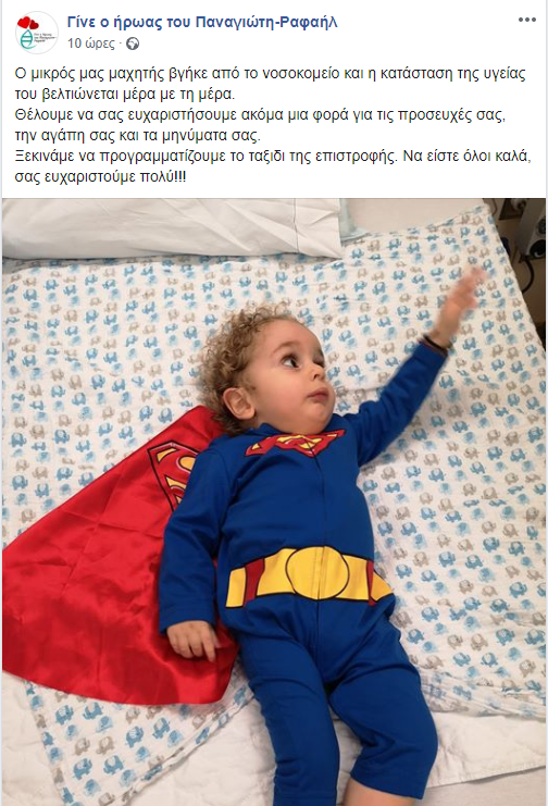 Συγκεκριμένα, οι γονείς του μικρού Παναγιώτη, μέσω της ιστοσελίδας Γίνε ο ήρωας του Παναγιώτη-Ραφαήλ, ενημέρωσαν για την πορεία υγείας του μικρού αγοριού με την παρακάτω ανάρτηση: