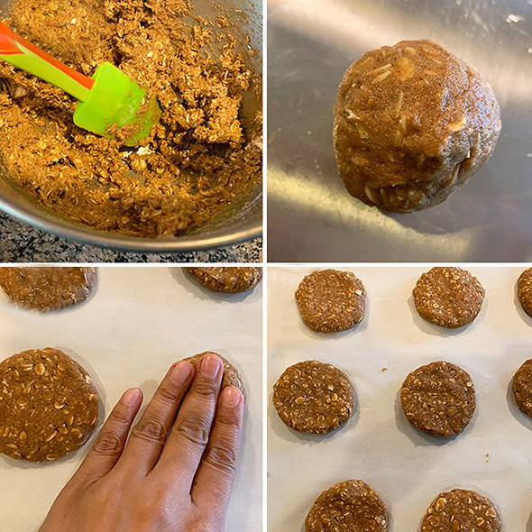 Χτυπάμε στο μίξερ το βούτυρο και τη ζάχαρη και έπειτα ρίχνουμε το αβγό, τη βανίλια, το αλεύρι, τη σόδα, το baking powder και το αλάτι. Ξαναχτυπάμε και στο τέλος, προσθέτουμε τις νιφάδες βρώμης.