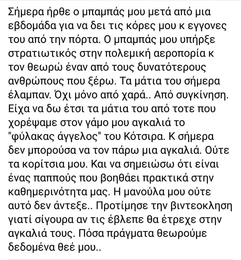 Είναι σημαντικό να τηρούμε με ευλάβεια τα μέτρα, όμως δεν είναι εύκολο να μην μπορείς να δεις τους γονείς σου και τα παιδιά σου τους παππούδες τους. Και όπως πολύ σωστά λέει και αυτή η μαμά «πόσα πράγματα θεωρούμε δεδομένα θεέ μου...»