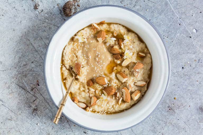 Σ’ ένα μικρό κατσαρολάκι βάζουμε τις νιφάδες βρώμης, το γάλα και προσθέτουμε το ταχίνι. Σε μέτρια φωτιά βράζουμε τα υλικά και ανακατεύουμε πολύ καλά.