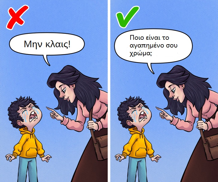 Όταν το παιδί νιώθει θυμωμένο, αδικημένο ή στεναχωρημένο για κάτι συγκεκριμένο, δεν ηρεμεί με την εντολή «μην κλαις!». Η καλύτερη συμβουλή που μας δίνουν οι… παλαίμαχοι γονείς, είναι να του αποσπάσουμε την προσοχή με κάτι άλλο. Έπειτα, αφού ηρεμήσουν τα πνεύματα, επανερχόμαστε στο συμβάν που το αναστάτωσε και το λύνουμε ήρεμα.