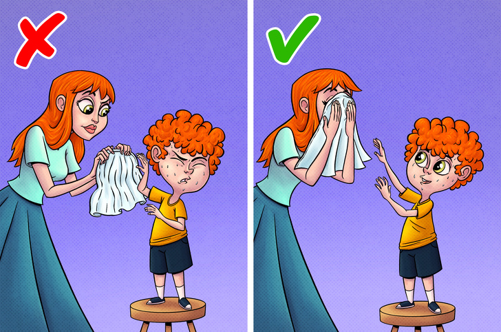 Τα παιδιά, ως γνωστόν, κάνουν αυτό που βλέπουν. Εάν θέλετε, λοιπόν, να πλύνει και να σκουπίσει καλά το πρόσωπό του για παράδειγμα, πηγαίντε στο μπάνιο, πλύντε το δικό σας πρόσωπο, σκουπίστε το καλά κι έπειτα το παιδί θα κάνει το ίδιο οικειοθελώς.