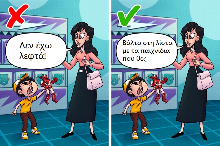 Μία συνήθεια που από προσωπική εμπειρία πιάνει πάντα. Αποφεύγω να επιμείνω στην άρνησή μου για ένα παιχνίδι επειδή ο οικογενειακός προϋπολογισμός δεν το επιτρέπει. Πάντα υπάρχει μία λίστα που γράφονται τα παιχνίδια που θέλει η κόρη μου και κάθε μήνα παίρνουμε από ένα. Συνήθως αναιρεί η ίδια τις επιλογές της και μαθαίνει να βάζει προτεραιότητες. Και το σημαντικότερο, δεν έχει έντονα ξεσπάσματα όταν θέλει κάτι και δεν μπορεί να το αποκτήσει.