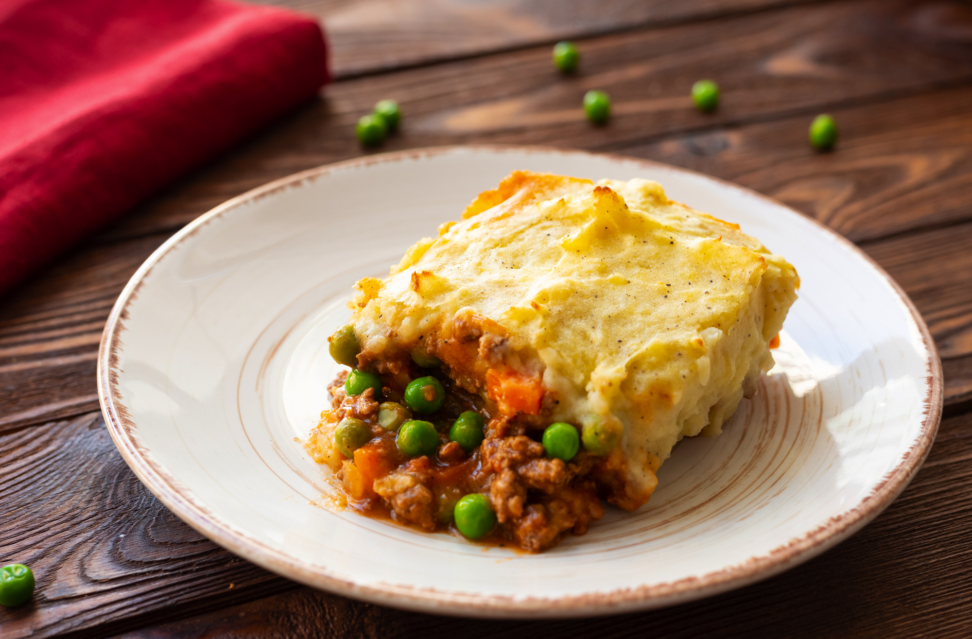 Σ’ ένα βαθύ ταψάκι, αδειάζουμε τον αρακά και από πάνω απλώνουμε τον πουρέ. Πασπαλίζουμε με την τριμμένη γραβιέρα και ψήνουμε για 25-30 λεπτά, ώσπου να ροδίσει.