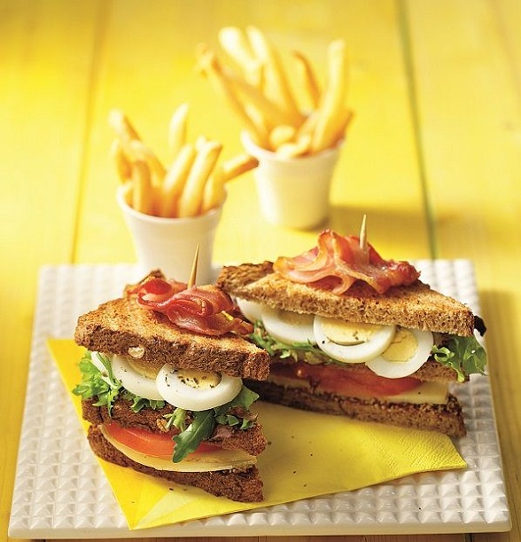 - Στη μία φέτα βάζετε δύο φέτες καπνιστό τυρί και δύο ροδέλες ντομάτας. Στην άλλη φέτα ψωμί βάζετε φύλλα σαλάτας και τα βραστά αβγά κομμένα σε ροδέλες και αλατοπιπερώνετε. Σκεπάζετε με την τρίτη φέτα ψωμί και διακοσμείτε με φέτες μπέικον.