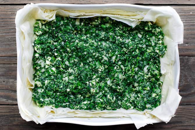 Λαδώνουμε ένα ταψί και τοποθετούμε το κάτω φύλλο. Προσθέτουμε τη γέμισή μας, φροντίζοντας να είναι ομοιόμορφη σε πάχος σ' όλο το σκεύος. Σκεπάζουμε με το πάνω φύλλο και τα ενώνουμε μεταξύ τους, διπλώνοντας τις άκρες των κομματιών που περισσεύουν προς τη μέσα πλευρά του ταψιού.