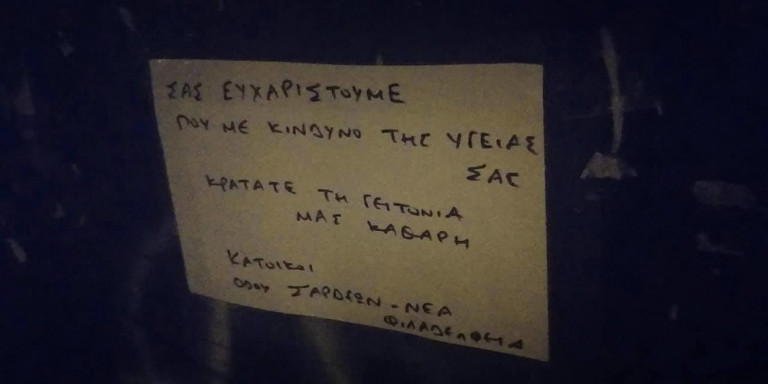 Σε έναν μικρό δρόμο της Νέας Φιλαδέλφειας στην Αθήνα, οι κάτοικοι αποφάσισαν να εκφράσουν την ευγνωμοσύνη τους για τους εργάτες καθαριότητας που συνεχίζουν απτόητοι το ζωτικό έργο τους. Άφησαν, λοιπόν ένα σημείωμα πανω στον κάδο: «Σας ευχαριστούμε που με κίνδυνο την υγείας σας κρατάτε τη γειτονιά μας καθαρή.»