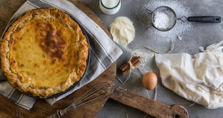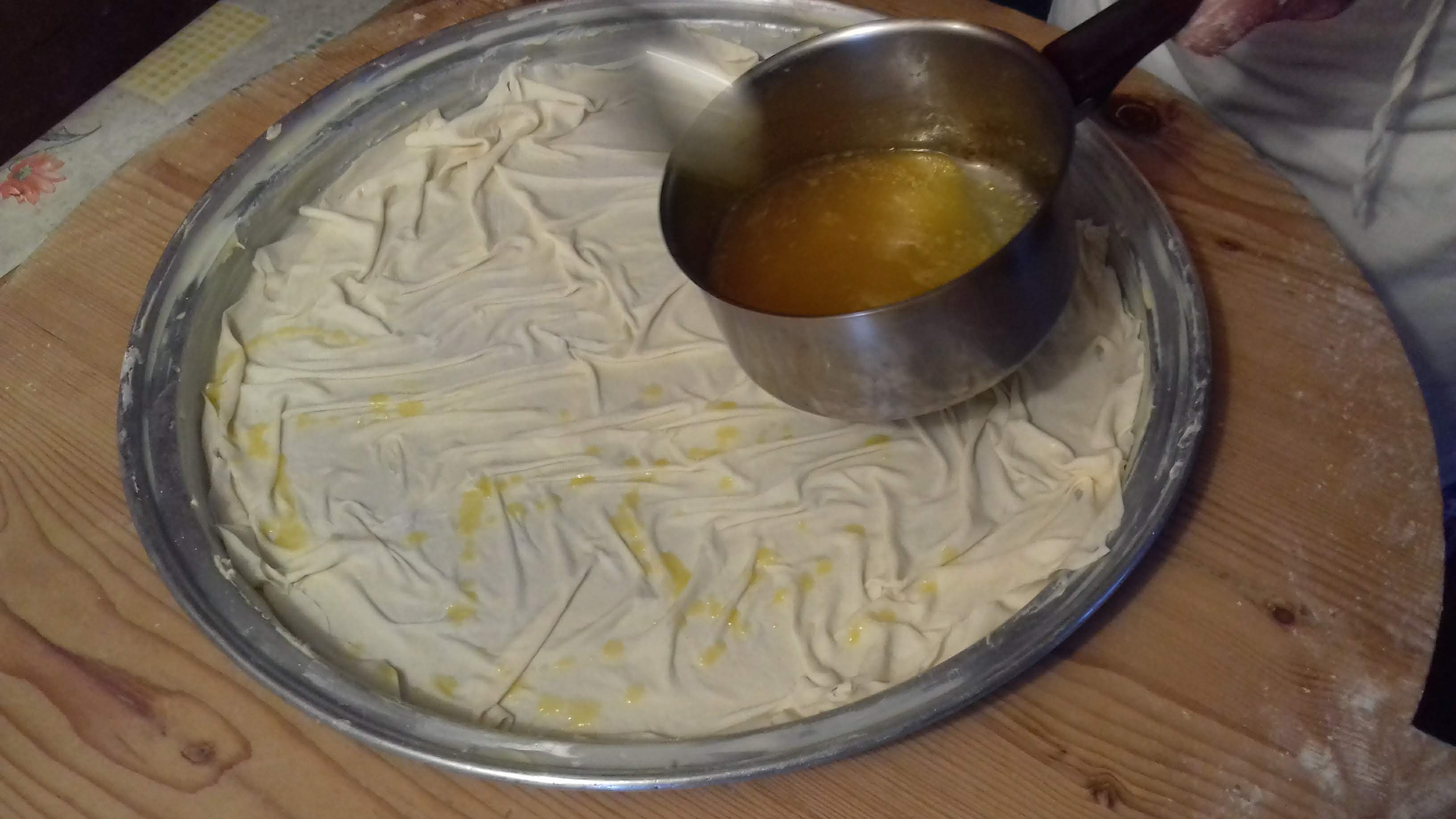Αδειάζουμε την κρέμα στο ταψί και κλείνουμε τα φύλλα γύρω γύρω (η μέση της πίτας μένει ακάλυπτη). Αλείφουμε τα φύλλα με όσο βούτυρο περισσέψει και ψήνουμε για περίπου μία ώρα σε προθερμασμένο στους 180οC φούρνο.