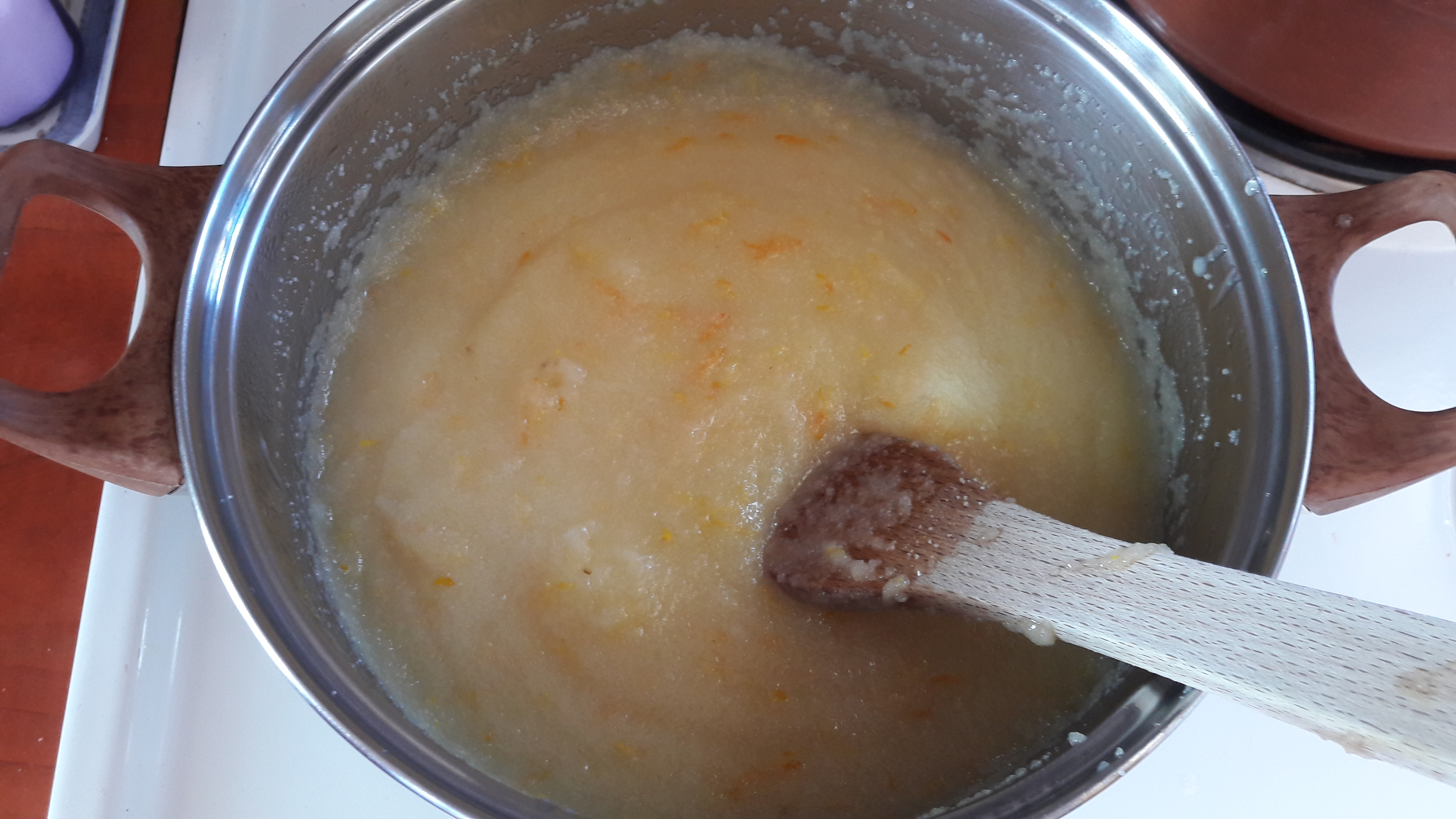Ξαναβάζουμε το μείγμα σε μέτρια φωτιά ανακατεύοντας συνεχώς για περίπου 10 λεπτά (μέχρι να πήξει). Το βγάζουμε από τη φωτιά, προσθέτουμε μία κουταλιά βούτυρο και το αφήνουμε να κρυώσει τελείως.