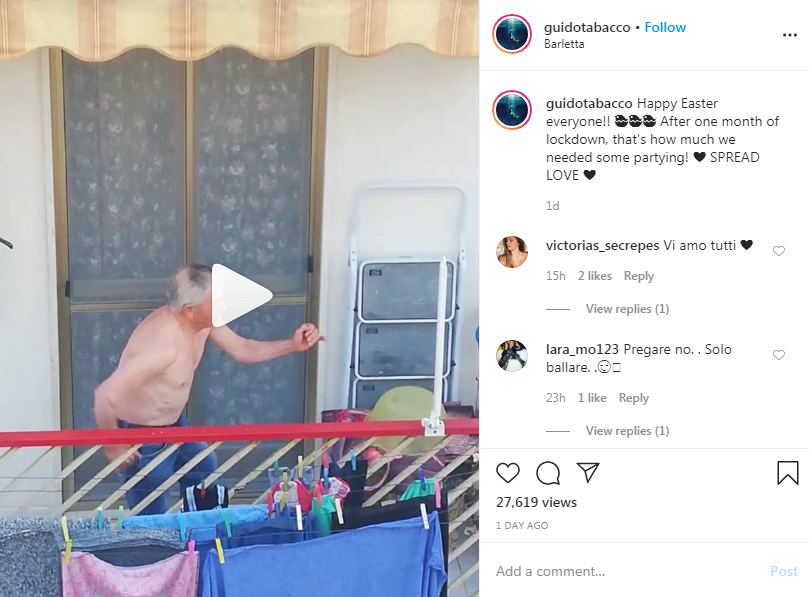Χαρακτηριστικό παράδειγμα μια γειτονιά της Μπαρλέτα, στον ιταλικό νότο, όπου οι κάτοικοι όλων των ηλικιών, ανήμερα της Κυριακής του Πάσχα, βγήκαν στα μπαλκόνια τους, χόρεψαν με την ψυχή τους, ήπιαν, τραγούδησαν, διασκέδασαν και γενικώς χαμογέλασαν σε ένα από τα πιο ευχάριστα και αισιόδοξα video της ημέρας, που αμέσως έγινε viral...