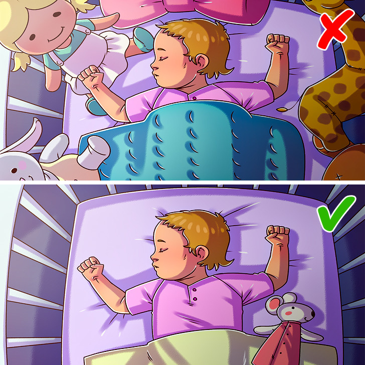 Βάλτε το μωρό να κοιμηθεί ανάσκελα, αποφεύγοντας τις βαριές κουβέρτες και τα πολλά παιχνίδια δίπλα του,ακόμα κι αν είναι μαλακά και μοιάζουν ακίνδυνα. Έτσι, δεν υπάρχει φόβος να βάλει στο στόμα του κάτι που δεν πρέπει ενώ δεν έχει αντιπερισπασμούς και κοιμάται ευκολότερα και περισσότερο.