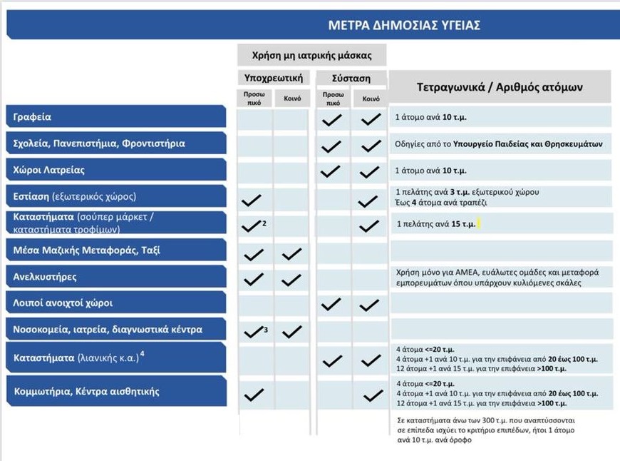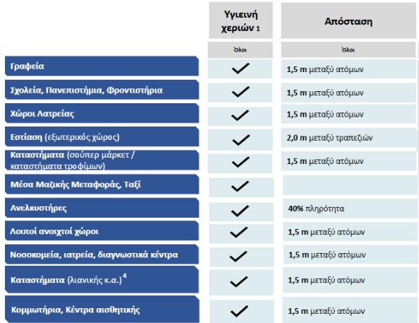 Σύμφωνα με τις οδηγίες για τη διαφύλαξη της δημόσιας υγείας τα νέα μέτρα ισχύουν στις βασικές κατηγορίες δημόσιων χώρων, όπως είναι τα: