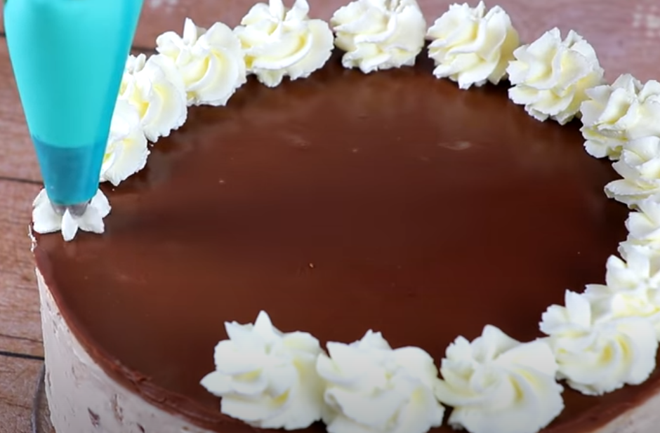 Απλώνουμε την λιωμένη κουβερτούρα και στολίζουμε το γλυκό μας με τούφες από σαντιγί (την οποία ετοιμάζουμε με τα υπόλοιπα 100ml κρέμα γάλακτος) και κομμάτια kinder bueno.
