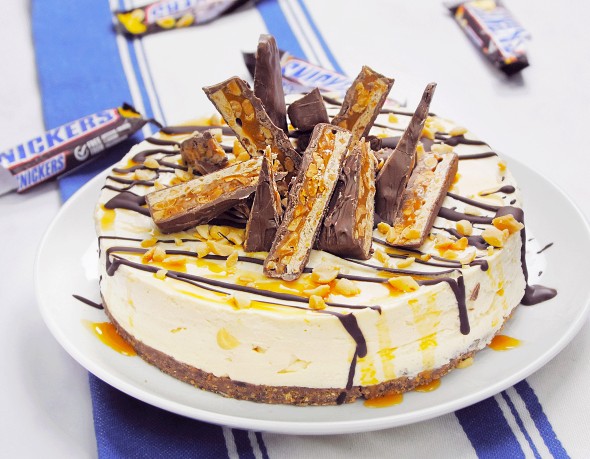 Ρίχνουμε το μείγμα με τα κομματάκια στο ταψάκι και αφήνουμε την τούρτα στην κατάψυξη για ένα ολόκληρο βράδυ (ή για 10-12 ώρες). Βγάζουμε την τούρτα απ’ την κατάψυξη και τη διακοσμούμε με σιρόπι καραμέλας, μερικά κομματάκια snickers που κρατήσαμε και σαντιγί.