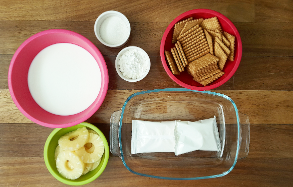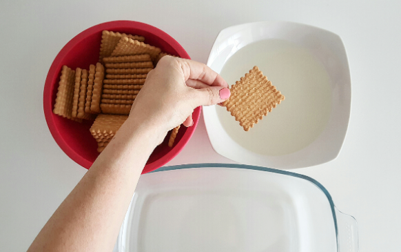 - Βάζουμε τον χυμό από την κονσέρβα ανανά σε ένα μπολ, βουτάμε για λίγα δευτερόλεπτα τα μπισκότα κι έπειτα τα στρώνουμε σε ένα ταψί (ή τάπερ).