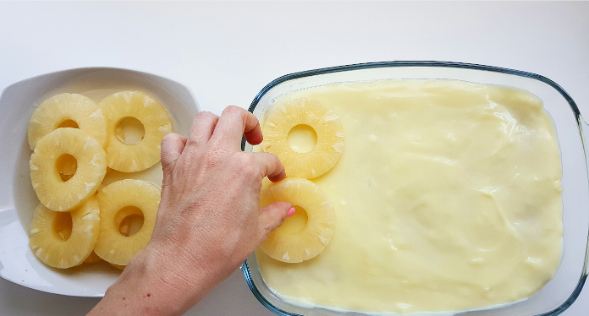 - Αφού στρώσουμε τα μπισκότα τα σκεπάζουμε με την κρέμα, τοποθετούμε τα κομμάτια του ανανά και ρίχνουμε από πάνω το ζελέ.