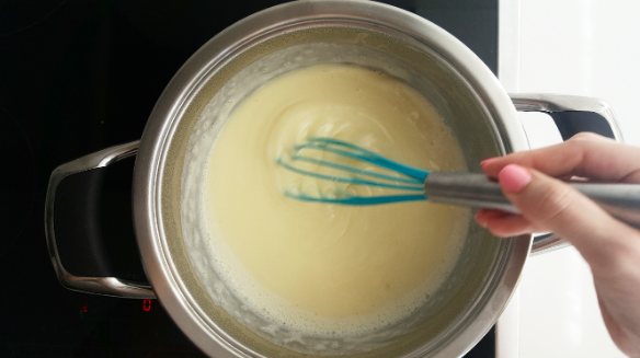 - Κρατάμε στην άκρη μια κούπα γάλα και το υπόλοιπο το βάζουμε σε μια κατσαρόλα να βράσει με τη ζάχαρη, ενώ στο φλιτζάνι με το γάλα που κρατήσαμε, διαλύουμε το κούσταρ πάουντερ.