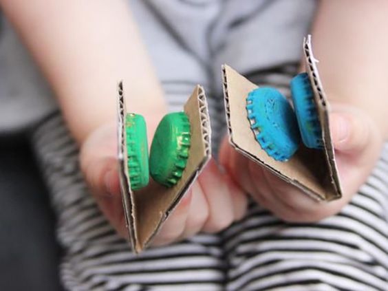 - Χρωματίστε τα καπάκια με όποιο χρώμα αρέσει στο μικρό σας και κολλήστε τα πάνω στο χαρτόνι από την ίδια πλευρά.