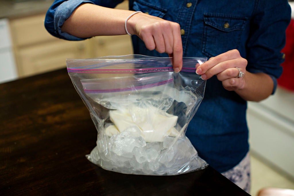 Κουνάμε δυνατά με τα δύο χέρια για 5-10 λεπτά, ώσπου να νιώσουμε ότι το μείγμα στη μικρή σακούλα έχει στερεοποιηθεί σε ικανοποιητικό βαθμό.