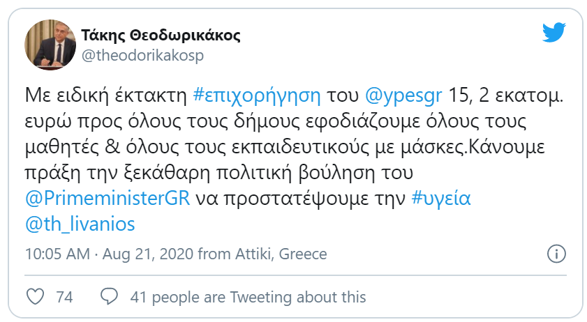 «Εμείς είμαστε έτοιμοι και αναμένουμε τις οδηγίες των λοιμωξιολόγων για τις προδιαγραφές των μασκών μετά και την χθεσινή εισήγησή τους για χρήση μάσκας απ' όλους τους μαθητές» είπε χαρακτηριστικά.