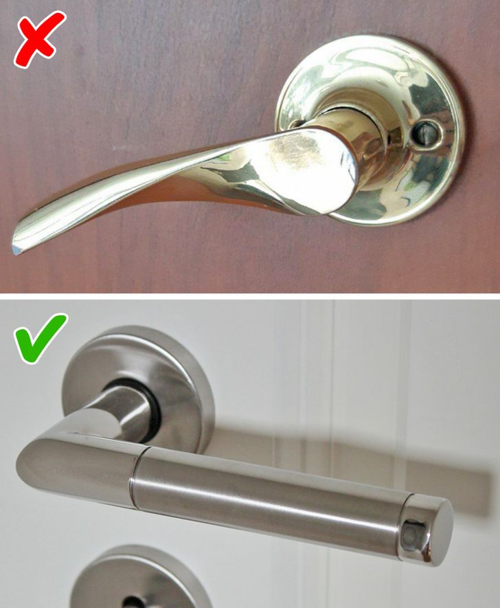 Οι διακοσμητές υποστηρίζουν ότι τα πόμολα σε αποχρώσεις του χρυσού είναι κακόγουστα! Σήμερα, όσο πιο απλό, τόσο το καλύτερο. Επομένως, είναι καλύτερα να τα αντικαταστήσετε με μεταλλικά ουδέτερα.