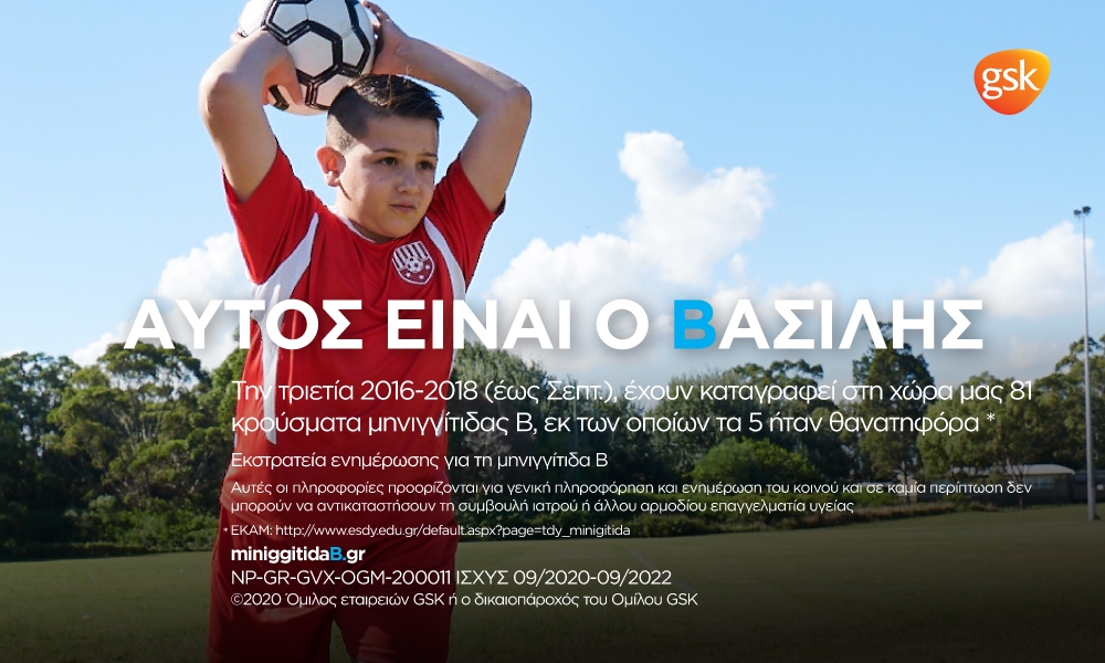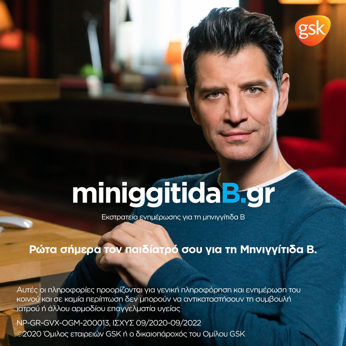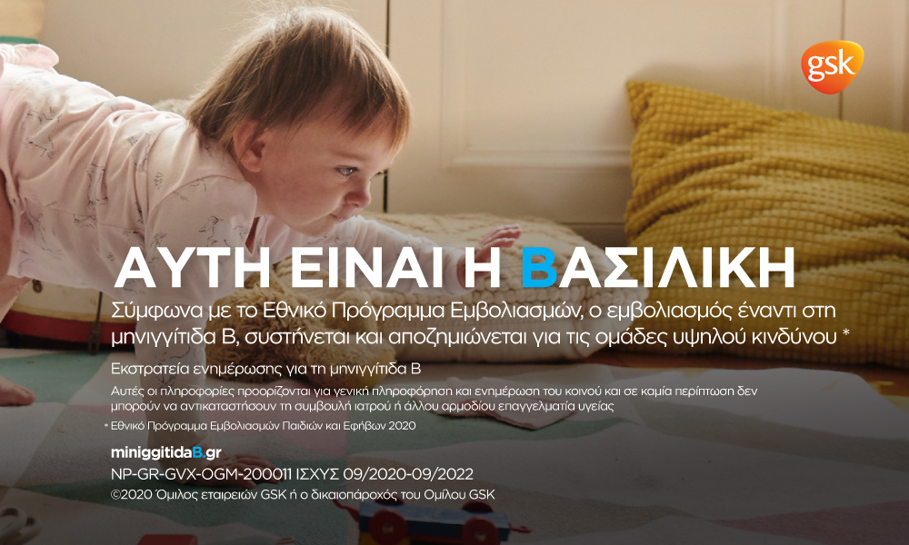 Η GSK ξεκινά στην Ελλάδα μια νέα παγκόσμια εκστρατεία ενημέρωσης του κοινού για την Μηνιγγιτιδοκοκκική Νόσο τύπου Β. Σκοπός της εκστρατείας είναι η ευαισθητοποίηση των γονέων αναφορικά με την μηνιγγίτιδα Β, μια σπάνια αλλά με σοβαρές επιπλοκές και δυνητικά θανατηφόρο νόσο, ούτως ώστε να συμβουλευτούν τον Παιδίατρό τους για το πώς μπορούν να προστατέψουν τα παιδιά τους.