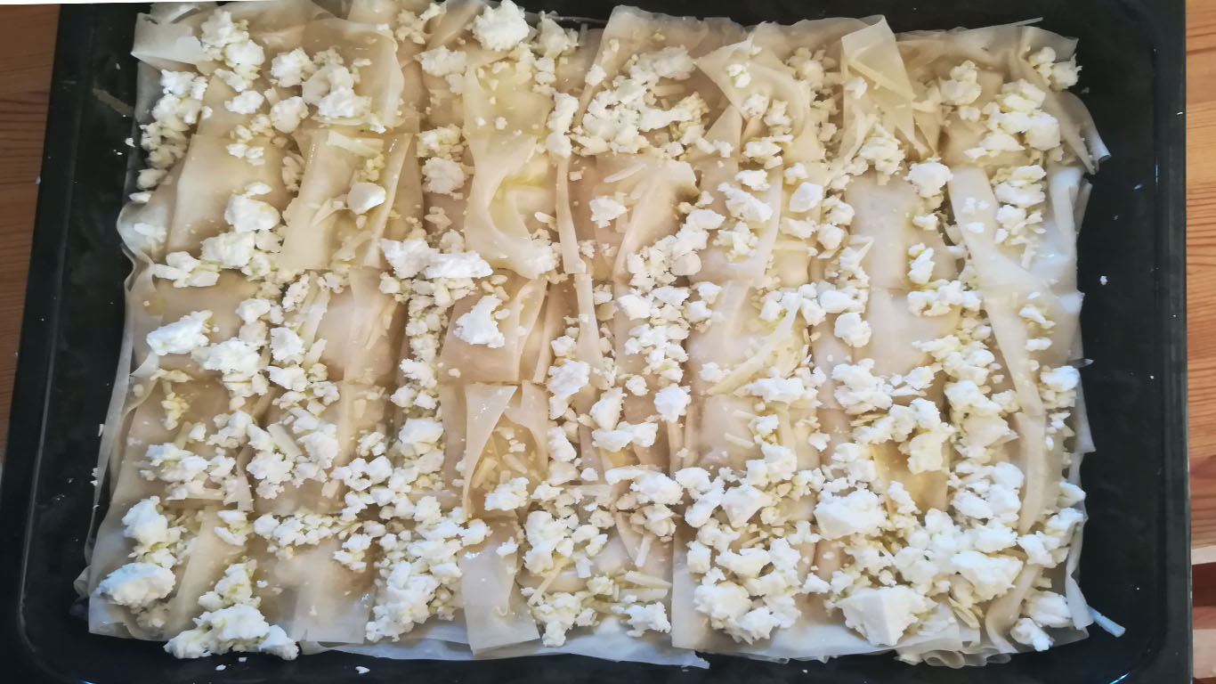 Στρώνουμε σε καλά λαδωμένο (ή βουτυρωμένο) ταψί ένα φύλο κρούστας και ρίχνουμε λίγη από την θρυμματισμένη φέτα. Στρώνουμε ακόμα ένα φύλο κρούστας, το λαδώνουμε και προσθέτουμε λίγη ακόμα φέτα. Συνεχίζουμε τη διαδικασία μέχρι να τελειώσουν όλα τα φύλλα κρούστας.