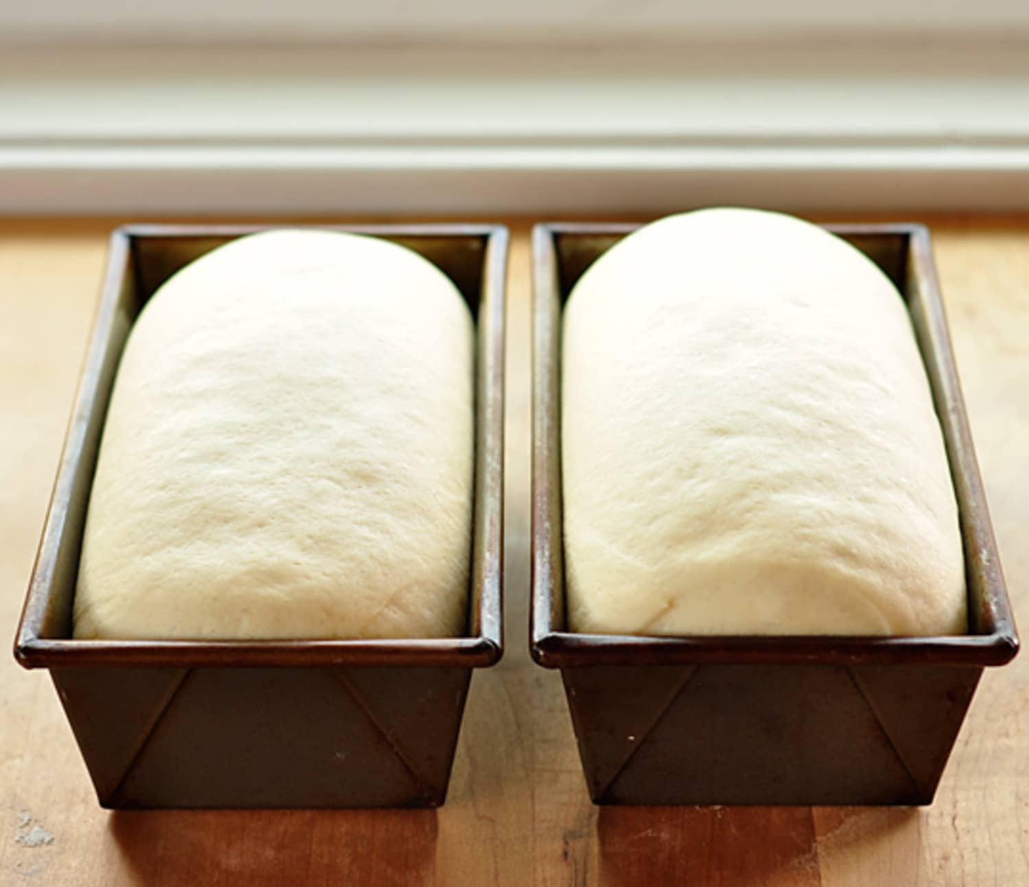 Πασπαλίζουμε λίγο αλεύρι στον πάγκο μας και χωρίζουμε τη ζύμη σε δύο ίσες μπάλες. Αφήνουμε τις μπάλες για 10 λεπτά να ξεουραστούν και κατόπιν σχηματίζουμε δύο μακρόστενες φρατζόλες στο μέγεθος της φόρμας. Λαδώνουμε τις φόρμες για κέικ και βάζουμε μέσα τις φραντζόλες (αν χρειαστεί τεντώνουμε να φτάσουν απ’ άκρη σ’ άκρη.