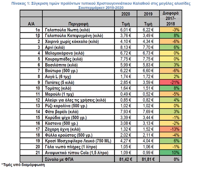 Σύμφωνα με τον πίνακα, από τις 22 υποκατηγορίες προϊόντων που εξετάζονται στην έρευνα, στις 10 οι τιμές παρουσιάζουν μείωση, σε 9 παρουσιάζουν αύξηση και 3 είναι αμετάβλητες. Η μεγαλύτερη μείωση καταγράφεται στην πατάτα κατά 21%, με την τιμή κιλού να μειώνεται από 0,72 ευρώ σε 0,57 ευρώ, κάτι που αποδίδεται σε διόρθωση της περυσινής αυξημένης τιμής (κατά 22%). Αντίθετα τη μεγαλύτερη αύξηση καταγράφουν τα αναψυκτικά κατά 10%.