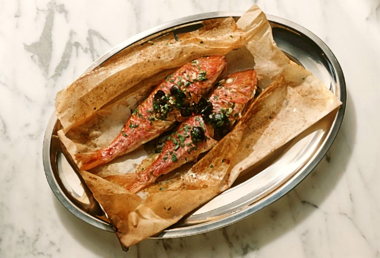 Βάζουμε επάνω το δενδρολίβανο ή το θυμάρι, τα δαφνόφυλλα και τις φέτες λεμονιού. Κλείνουμε τη λαδόκολλα, αλλά όχι ερμητικά, και ψήνουμε για 20-25 λεπτά.